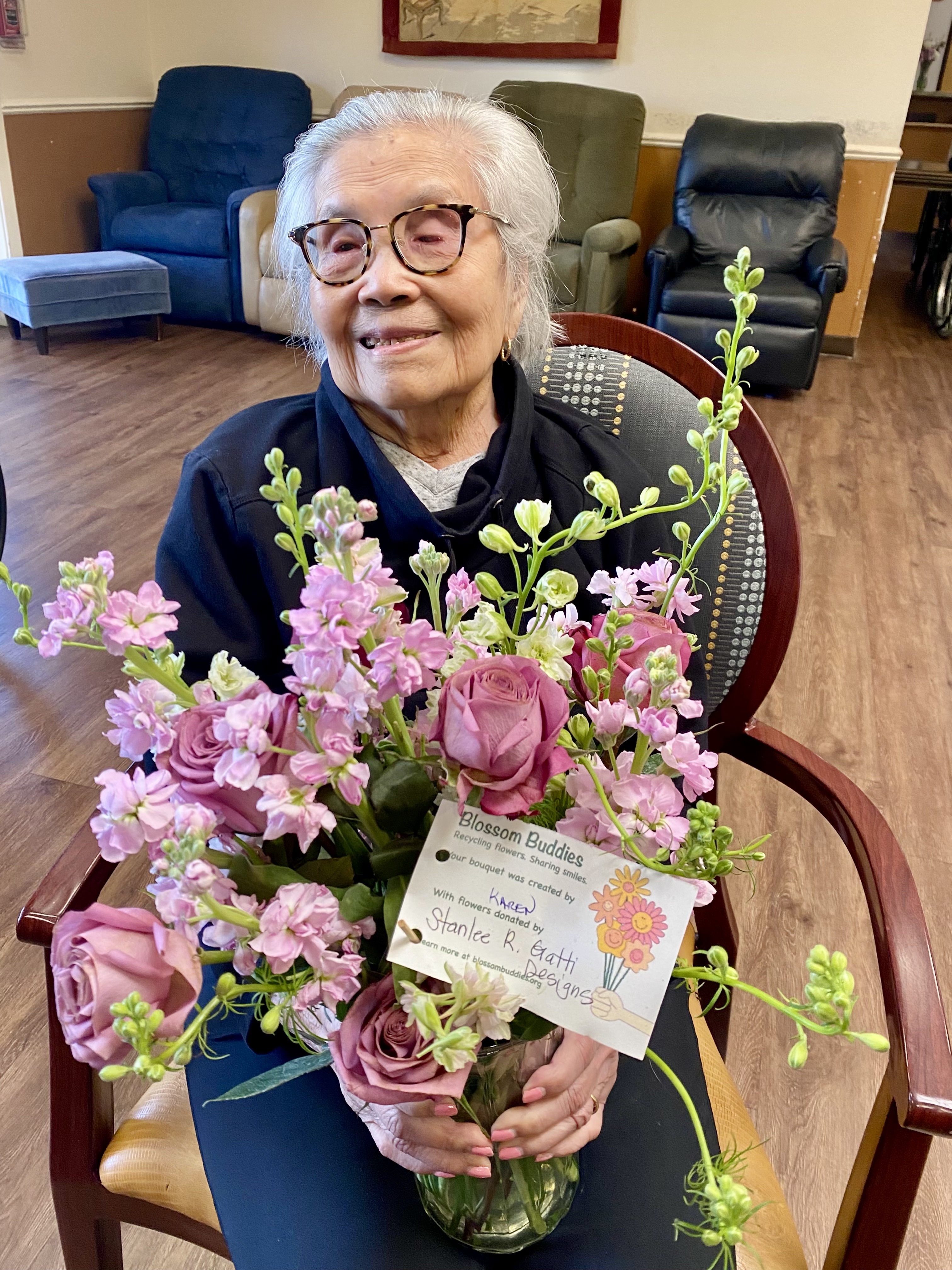 Blossom Buddies is a group of volunteers in the south San Francisco Bay Area who recycle flowers into beautiful bouquets and deliver them free of charge to residents in health care facilities who need a little extra cheer. Recipients are consistently surprised and delighted by their bouquets. In 2024, Blossom buddies crafted and delivered 3,318 bouquets.